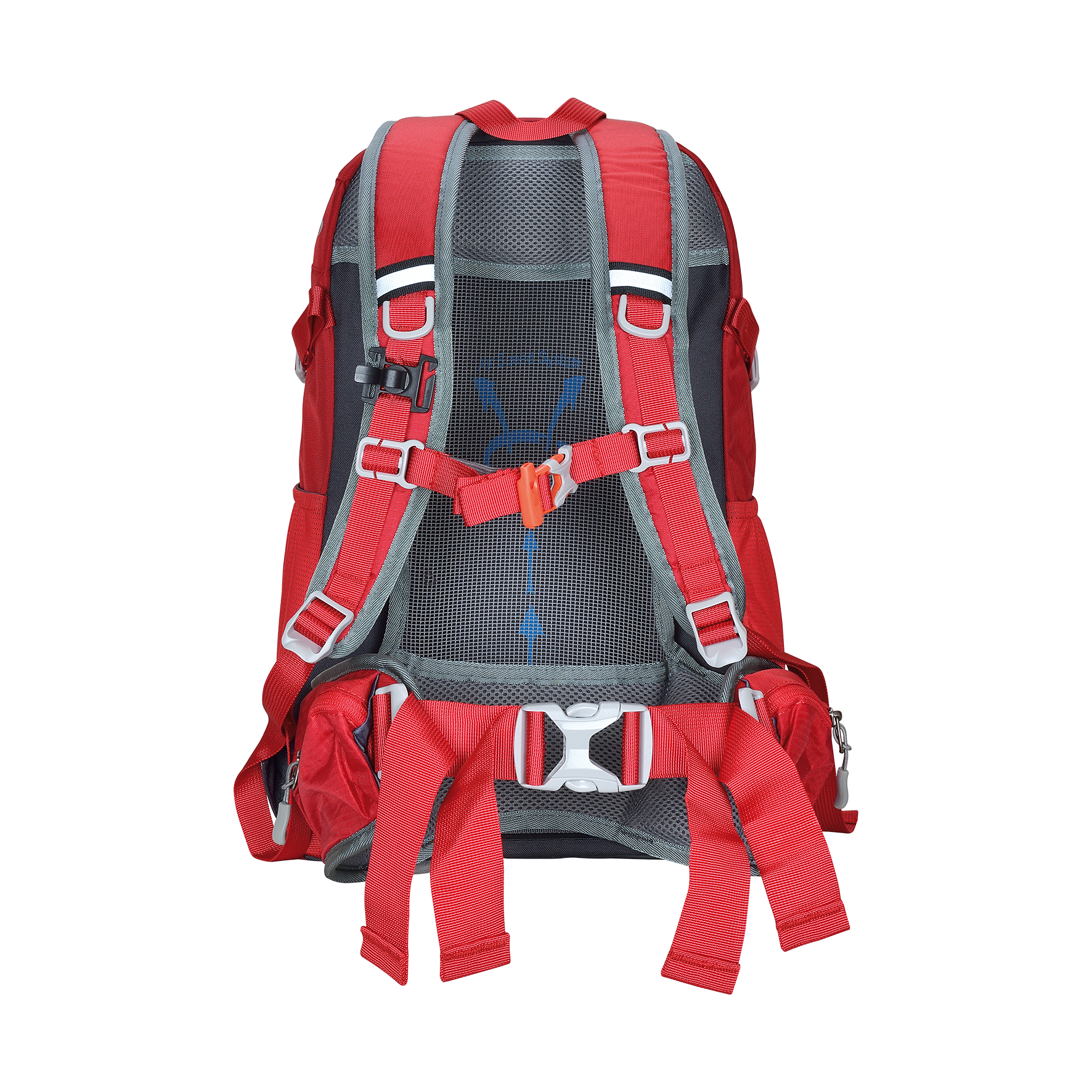 Funda para la lluvia, tensor de pecho, silbato de emergencia, cintas compresión lateral, bolsillo rejillas laterales, riñonera con bolsillos, soporte para bastones, acceso hydrobag, modelo unisex.